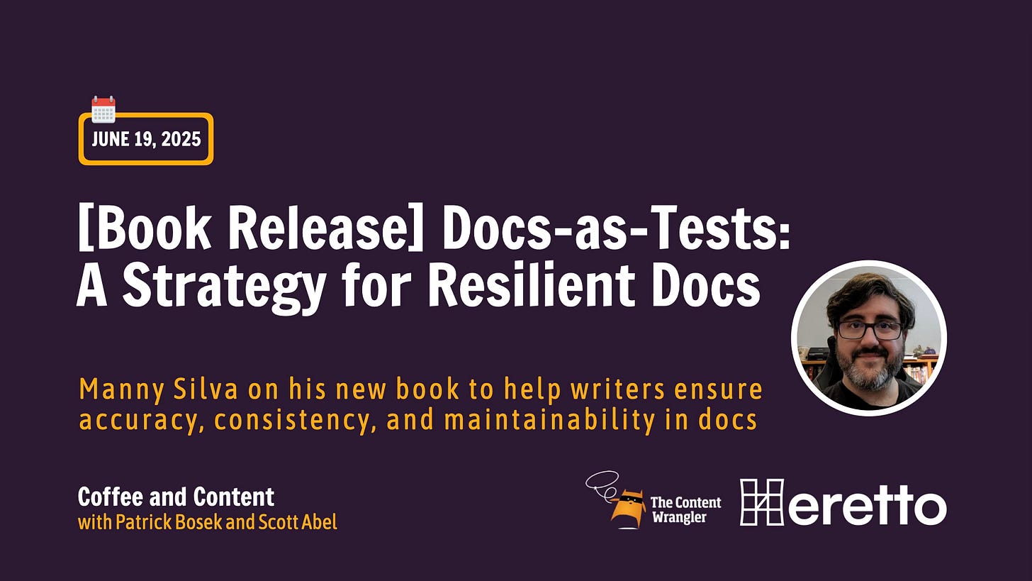 Join us for a chat with Manny Silva, head of documentation at SkyFlow, and author of the newly released book, “Docs as Tests: A Strategy for Resilient Technical Documentation.” Manny will introduce us to the Docs-as-Tests approach—an innovative strategy that treats documentation as a first-class citizen in the software development lifecycle. Stick around for live Q&A—bring your questions and curiosity. One lucky viewer will win a free copy of Manny’s new book.