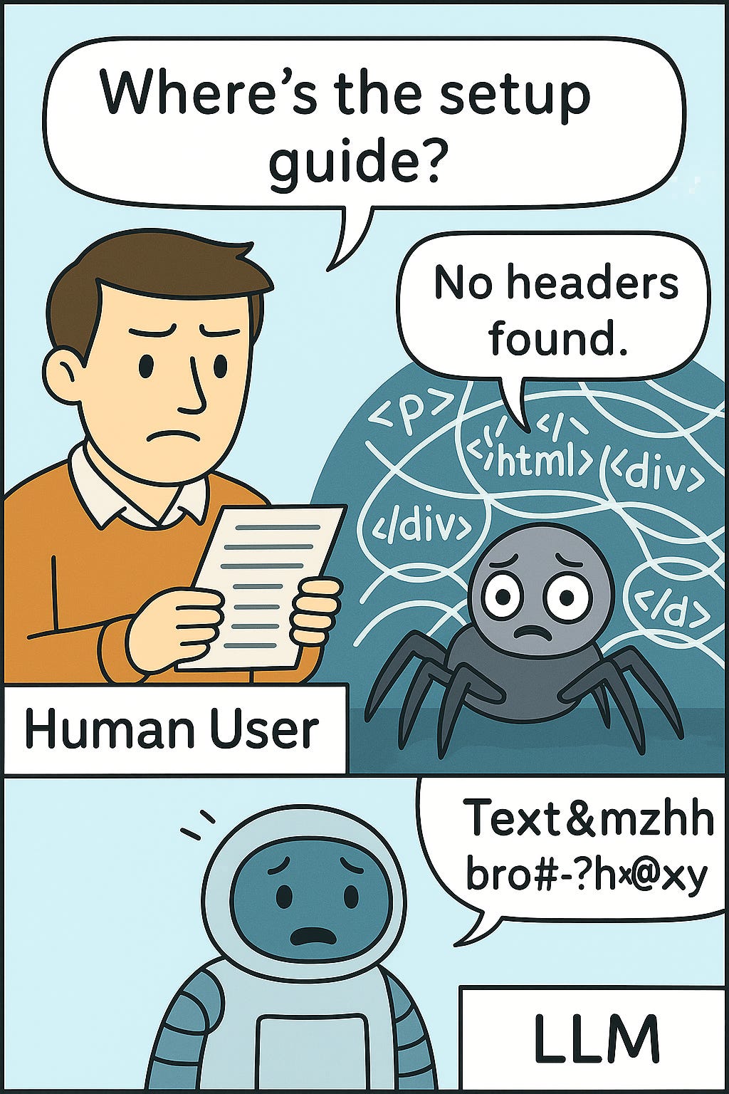 Three groups now read your content: the human who needs help fast, the search engine crawler that indexes your page, and the large language model (LLM) that spits out your words in someone else's chatbot session. All three are trying to understand what your content is about. If it's not clear, they'll get confused, make things up, or move on. Think of them like houseguests: keep things tidy, label the snacks, and don't make them hunt for the bathroom.