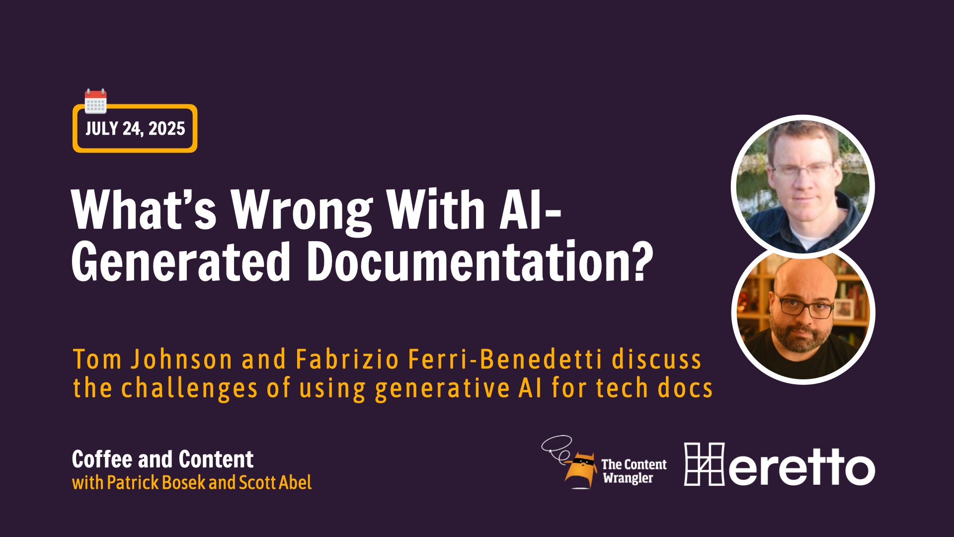 Tom Johnson, creator of I’d Rather Be Writing, and Fabrizio Ferri-Benedetti, technical communication expert — will unpack the challenges and pitfalls of relying on AI-generated docs. Drawing inspiration from the thought-provoking piece written by Ferri-Benedetti entitled, What’s Wrong with AI-Generated Docs?, they’ll discuss the shortcomings, practical issues, and unexpected consequences of letting AI take the wheel in tech comm. Expect an honest discussion about accuracy, consistency, and whether generative AI is truly ready to replace human writers.